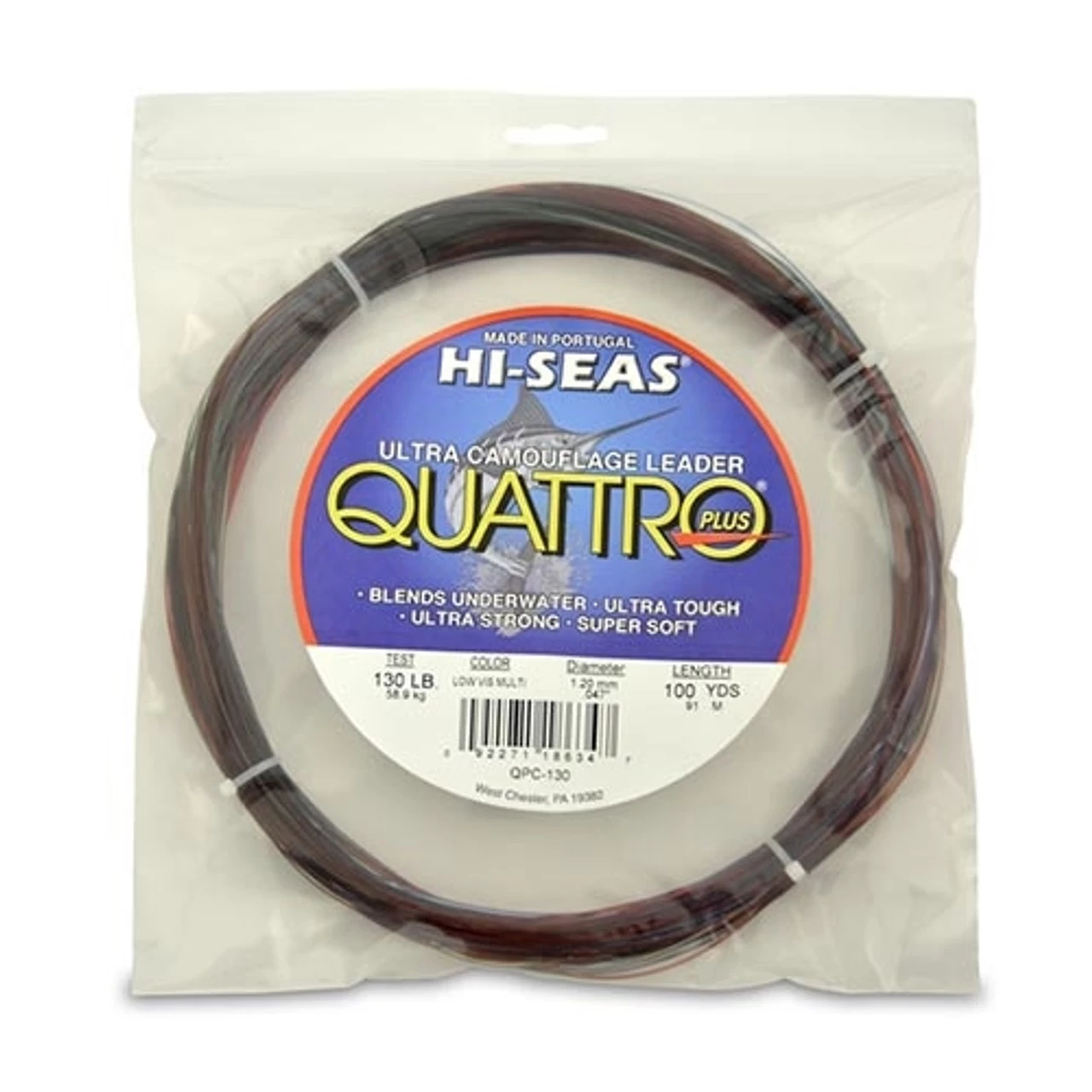 The Quattro Camo Leader is a monofilament line designed for use as a leader line attached to braided spectra. Hi-Seas developed their Quattro leader line using a unique blend of four scientifically selected colors in short lengths which break up the visual pattern underwater and therefore camouflages the line blending it into the background. The Quattro Leader line is a fairly soft and supple line, properties which aid in knot tying for both making rigs and attaching to the main line. Despite the line’s soft nature, it still exhibits incredible strength that is capable of resisting abrasion which could damage the line’s integrity. We offer the Hi-Seas Quattro Camo Monofilament Leader line in four sizes: 130, 200, 250 and 300lb all of which come in a 100yd coil.