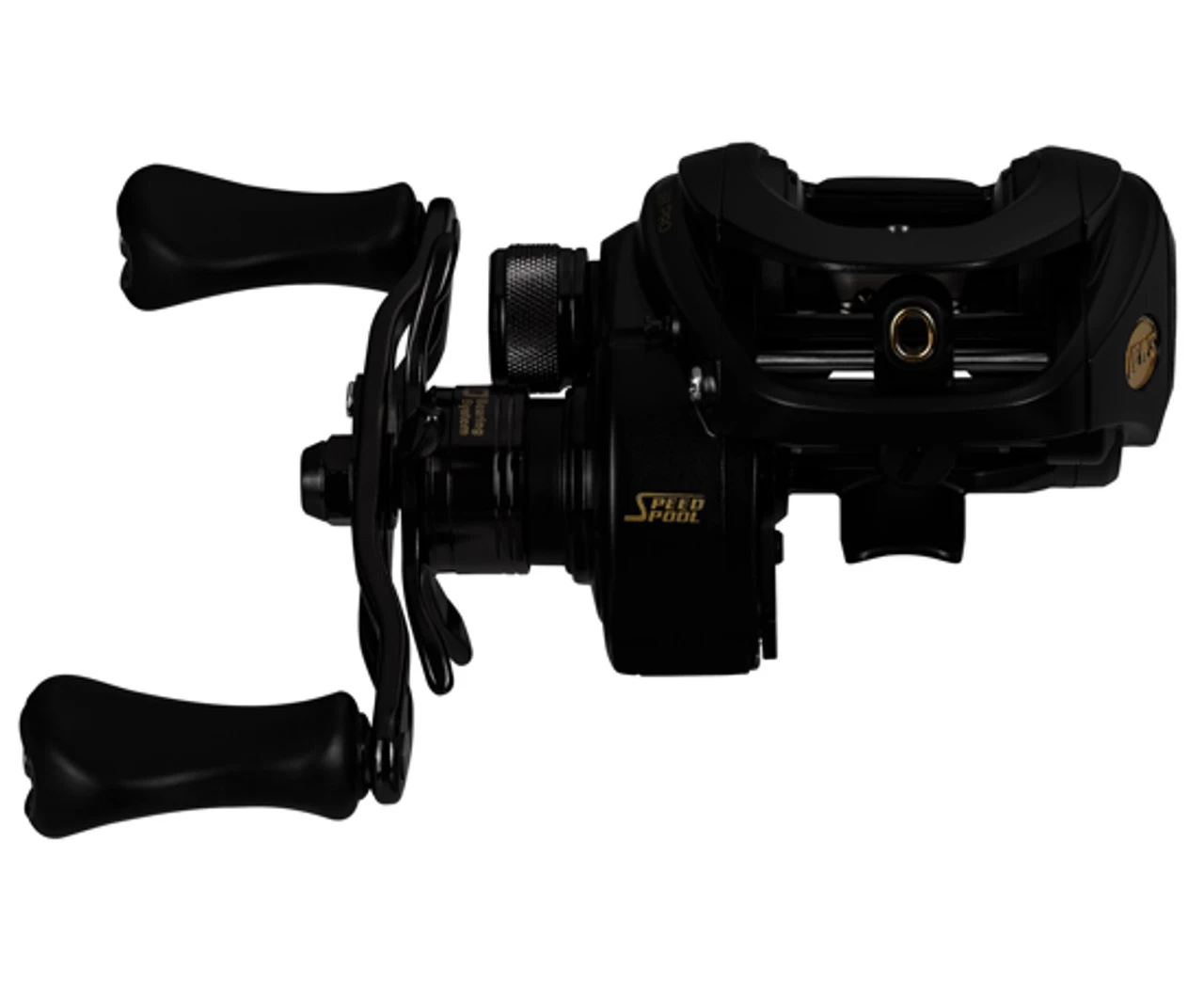 - 95mm BOWED HANDLE is made of lightweight anodized aluminum with Lew’s Pro Power knobs to smoothly translate angler effort into cranking power